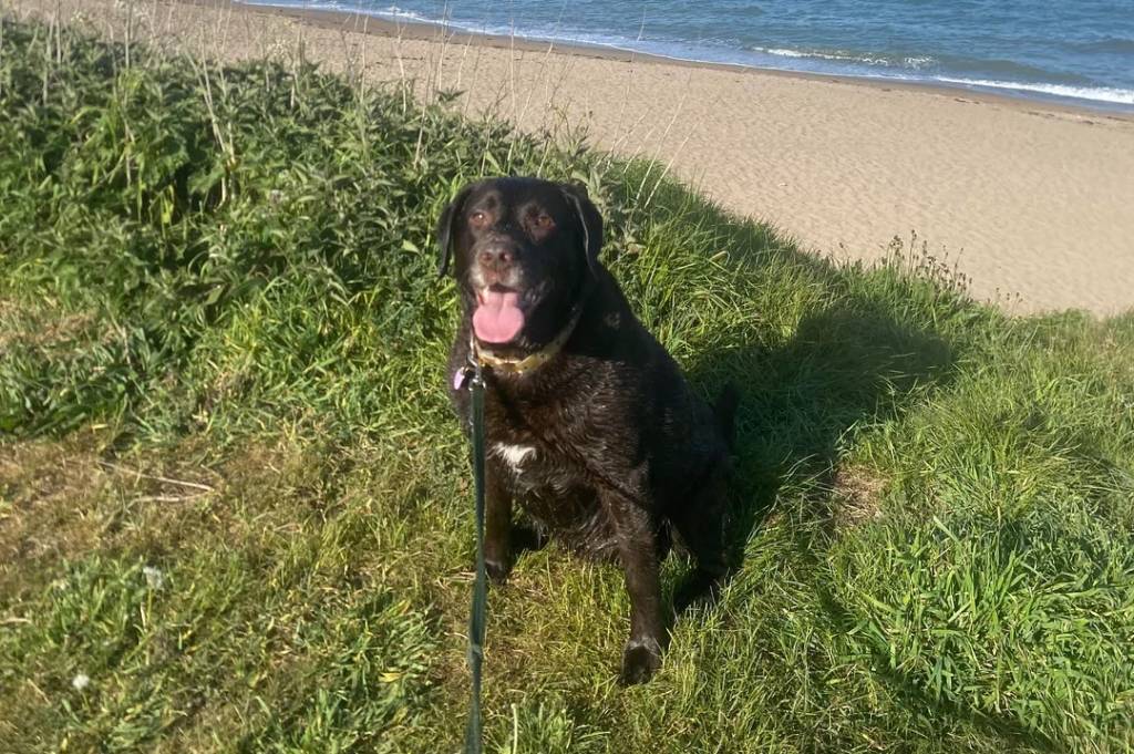Un Labernois assis sur un terrain herbeux tirant la langue et tenu en laisse