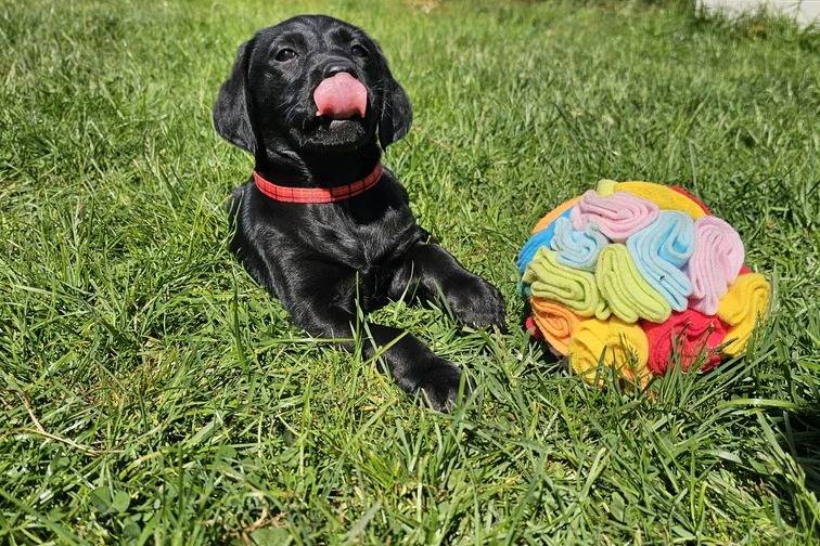 Un Labernois allongé sur un terrain herbeux et portant un collier au cou