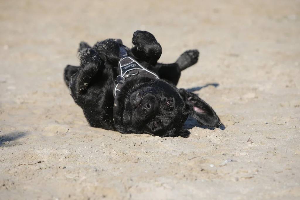 Un Labernois allongé de dos sur une surface sableuse et portant un harnais