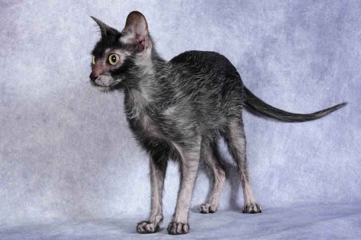 Un Lykoi qui vient d'être recueilli prend son premier bain