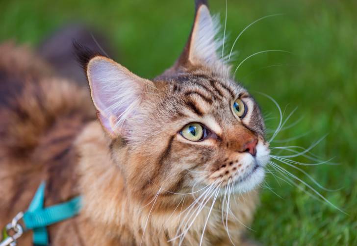 Vue proche d'un jeune Maine Coon pendant une promenade en laisse