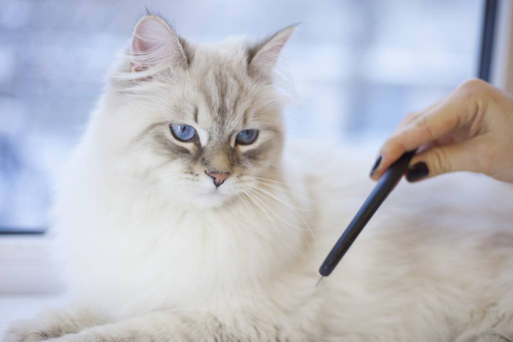 Une femme joue avec un Neva Masquerade blanc aux yeux bleus