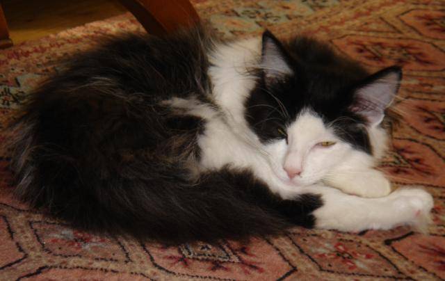 News est arrivé chez nous le jour de noël, notre plus beau noël. C'est un petit rescapé: sa patte arrière broyée à la naissance n'avait pu pousser correctement ce qui faisait de lui un infirme, un chat hors concours.On me le donna donc... La patte du bonheur car de tous mes norvégiens, et j'en ai cinq, il est le plus tendre, le plus attaché, le plus joueur ( nous lui faisons de petites boules de papier qu'une fois lancées il rapporte et dépose sur nos genoux).