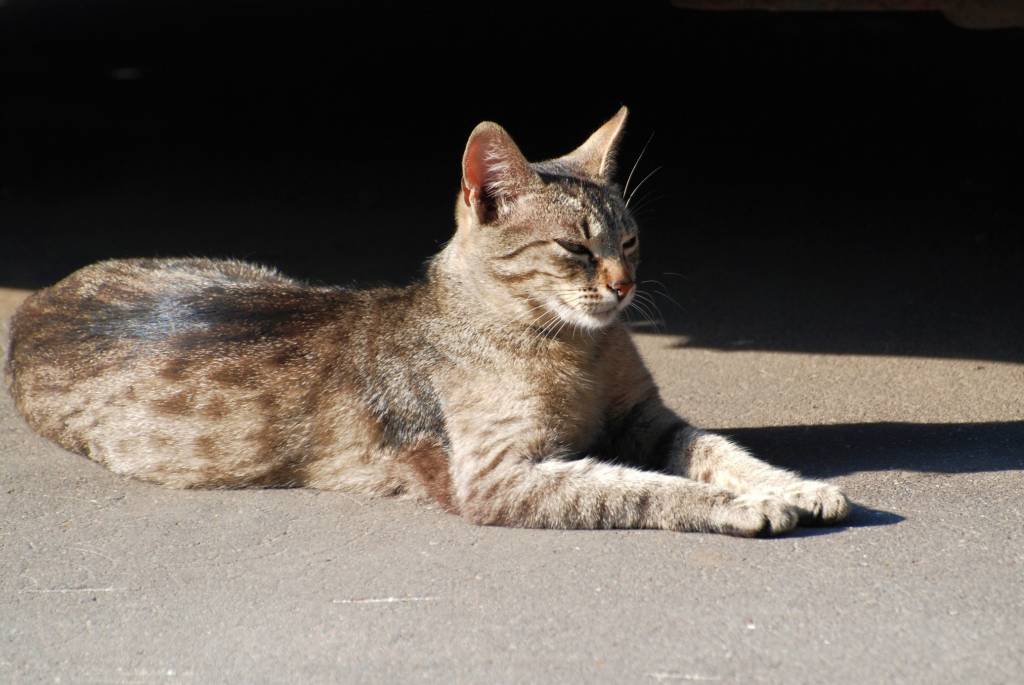Un Ocicat allongé sur un trottoir au soleil