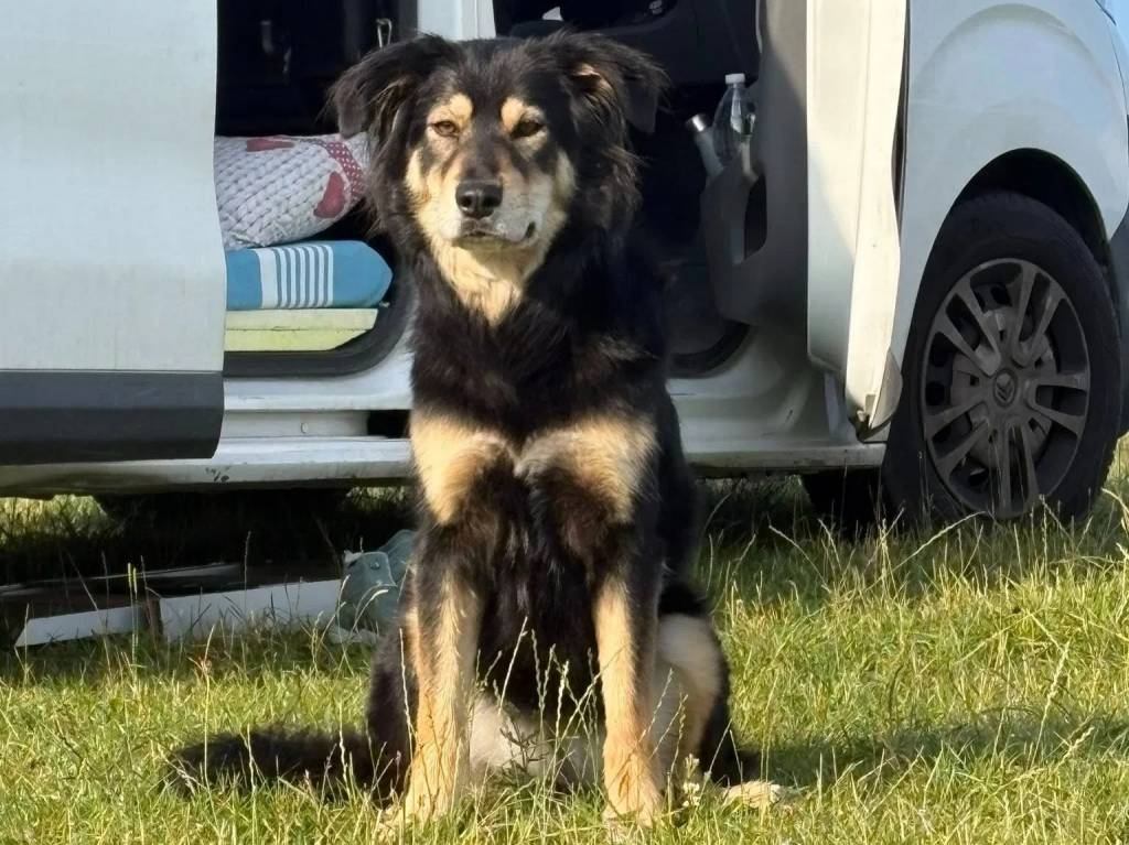 Un Pastore della Sila assis sur une surface herbacée et semblant détendu