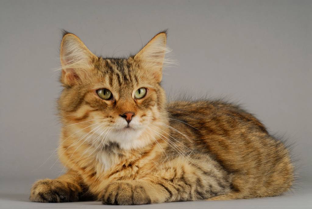 Un Pixie Bob tricolore allongé devant un fond gris