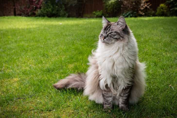 Un Ragdoll assis sur du gazon parfaitement entretenu