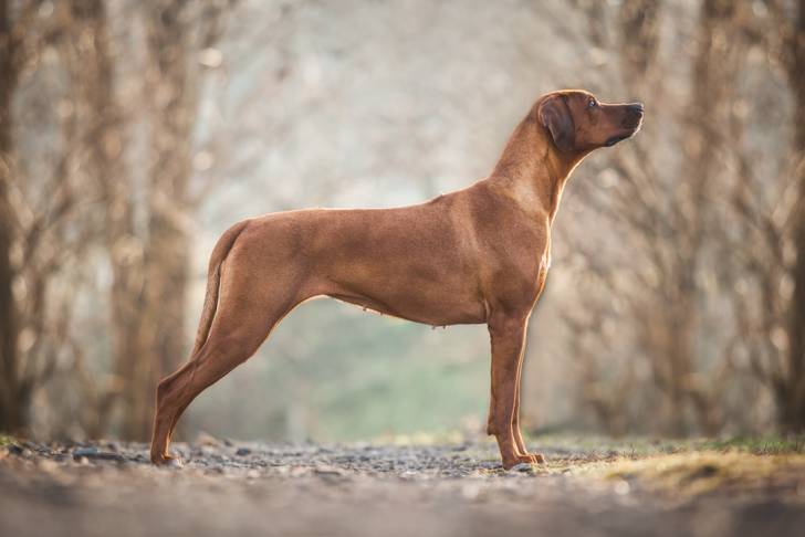 Un Rhodesian Ridgeback en position statique au milieu d'un sentier