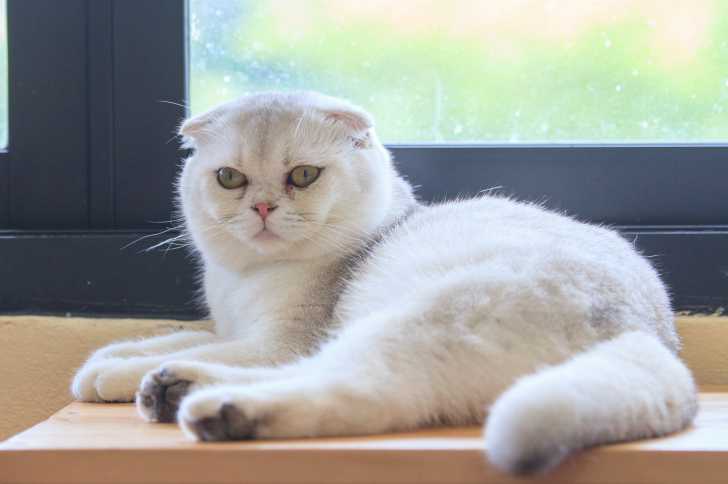 Un Scottish Fold blanc couché devant une fenêtre
