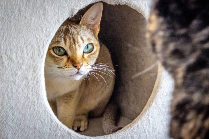 Un Singapura montre ses talents de grimpeur sur une fenêtre