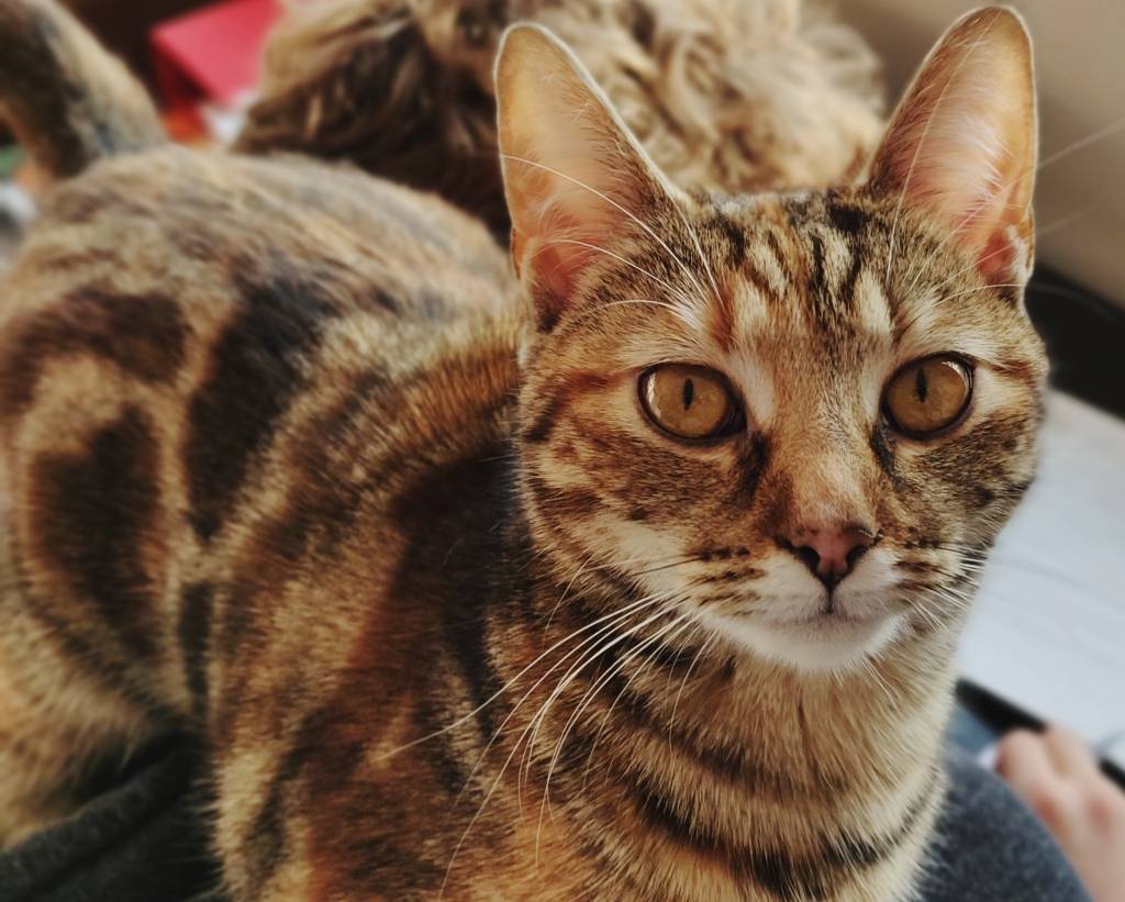Un Sokoké marbled sur les épaules d'un homme