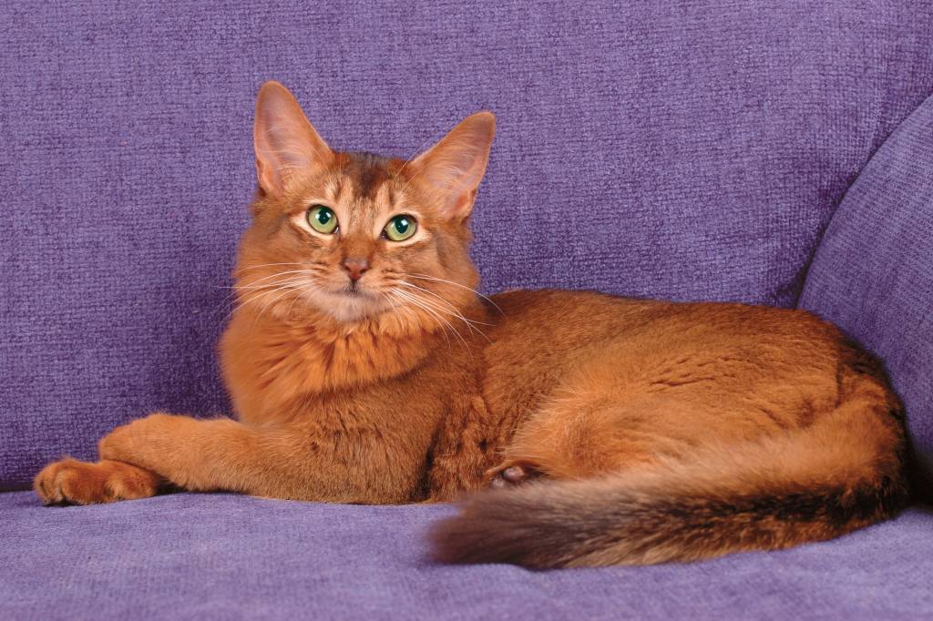 Un beau Somali roux tiqueté aux yeux verts allongé sur un fauteuil