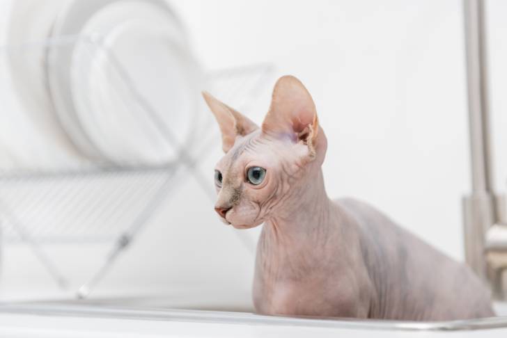 Un chaton Sphynx prend un bain
