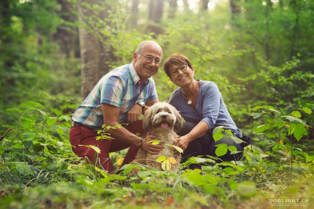 Un Terrier du Tibet assis devant deux personnes âgées et regardant vers la caméra