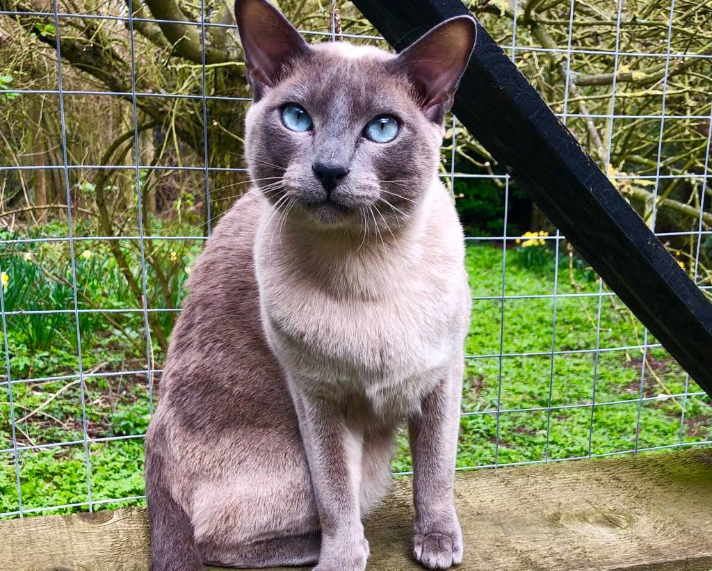 Un Tonkinois gris aux yeux bleus assis devant un grillage en extérieur