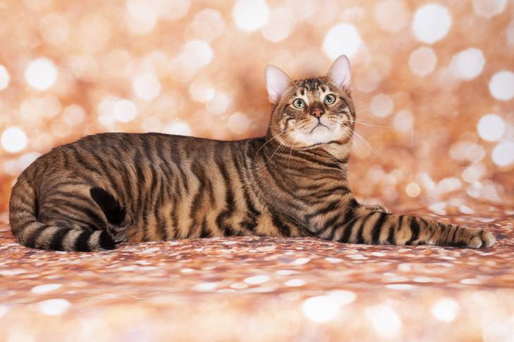 Un chat Toyger allongé sur un fond rose