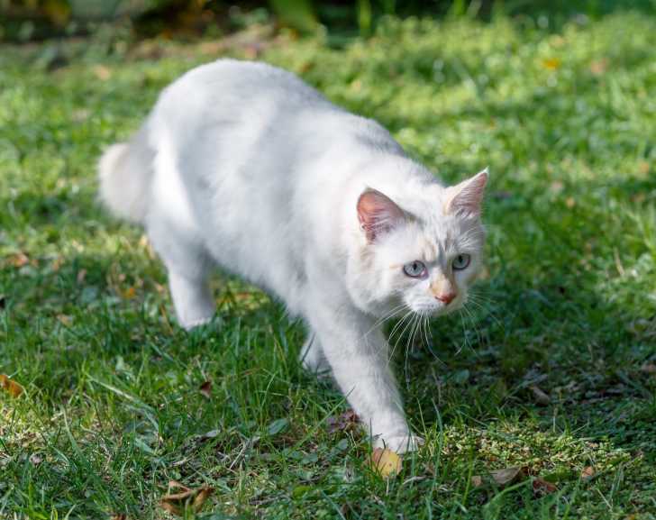 Un Turc de Van entièrement blanc marchant dans l'herbe