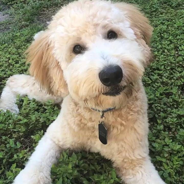 Un Woodle au pelage blanc, tranquillement allongé dans l'herbe