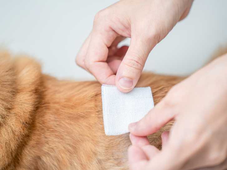 Une fois que la plaie a été nettoyée puis désinfectée, il ne reste plus qu’à la panser : ce n’est pas obligatoire, mais c’est recommandé au moins les premiers jours. En effet, cela empêche qu’elle ne se salisse ou que le chat ne se lèche – ce qui pourrait le conduire à avaler du produit désinfectant, et ce faisant à tomber malade.