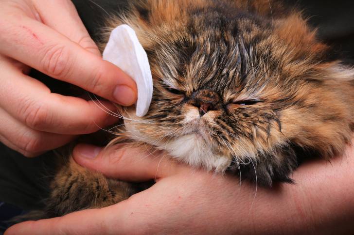 Si le chat a du mal à cligner des yeux à cause du liquide, il est possible de l’aider en lui ouvrant et fermant très délicatement les paupières pour bien répartir le sérum. Enfin, il faut essuyer en douceur le surplus éventuel autour de chaque œil, car la peau ne doit pas rester humide après le soin.