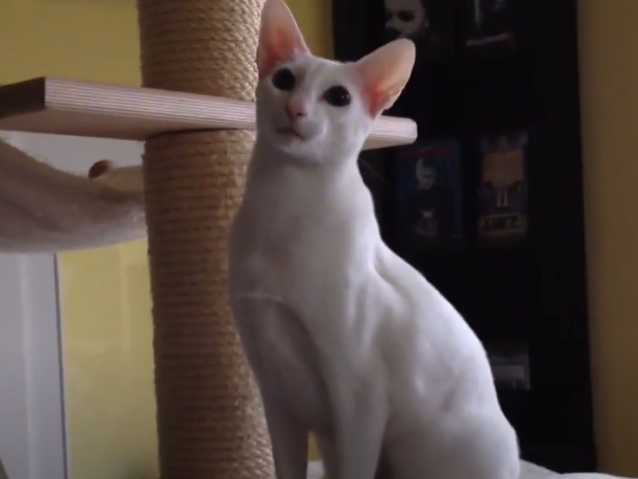 Cette vidéo montre un chat de race Foreign White qui est assis dans le panier de l'arbre à chat. En effet, le félin est calme et semble apaisé. Son propriétaire lui donne quelques caresses, ce qui lui plait vivement !