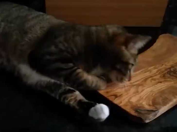 Dans cette vidéo, ce chat se frotte généreusement contre ce morceau de bois d'olivier, et fait mine de jouer avec. Il se roule également par terre, l'air de bien s'amuser.