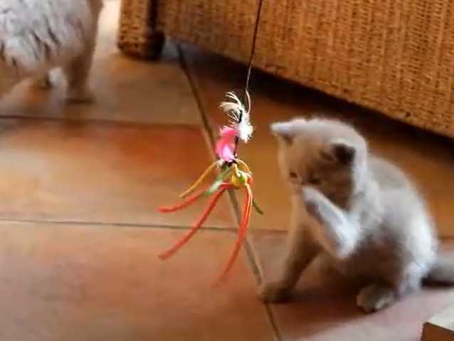 Cette vidéo montre un chaton de race British Shorthair en train de jouer avec un plumeau. En effet, le félin s'amuse comme un petit fou lorsque son maitre agite le jouet devant lui.