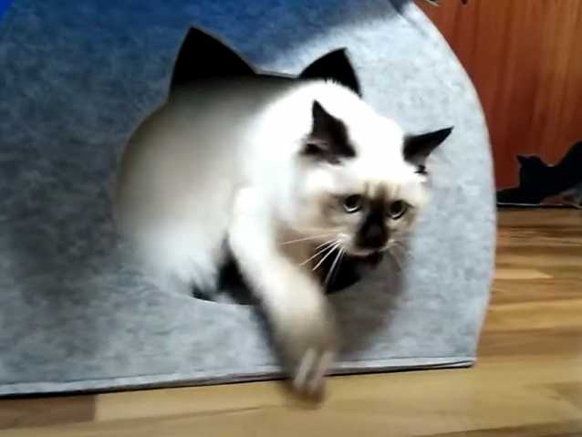 Bien que le chat soit réputé être un animal indépendant et impliquant peu de contraintes (moins qu’un chien, par exemple), il exige tout de même que son maître lui aménage un cadre de vie adapté et confortable, avec notamment divers accessoires pour chat. Cette vidéo montre un chat de race Sacré de Birmanie en train de profiter pleinement de sa cabane/coussin. Le félin semble adorer ce coin cosy.