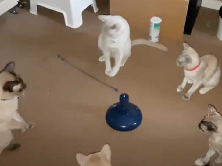 Cette vidéo montre une fratrie de chats Tonkinois en train de jouer. En effet, les félins cohabitent ensemble et semblent très complices : ils jouent sans aucune agressivité avec un jeu qui les intrigue très fortement.