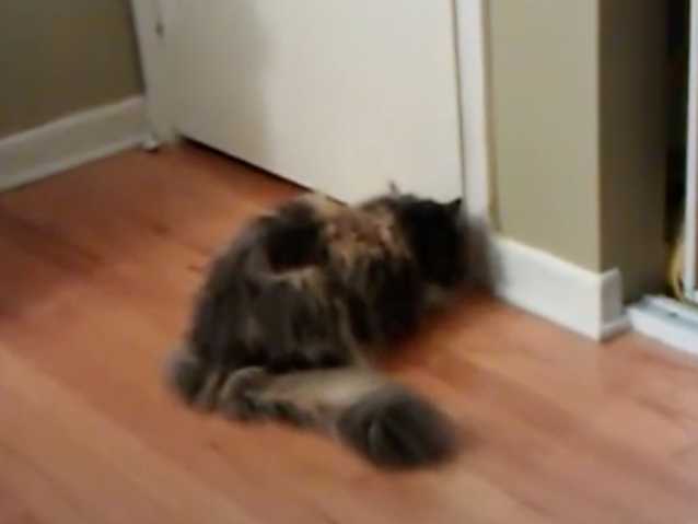 Cette vidéo montre un chat Anatoli qui est intrigué par quelque chose derrière une porte. En effet, le félin est installé devant la porte et scrute le dessous de celle-ci. Ensuite, il s'installe au milieu de la pièce pour s'y reposer.