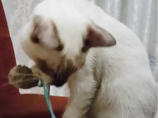 Le Bobtail du Mékong est connu pour avoir un tempérament de grand joueur. Cette vidéo ne déroge pas à la règle : le félin joue avec un harnais bleu. En effet, il le mordille, lui donne des coups de patte et le déplace.