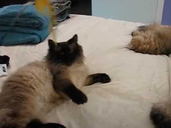 Chat qui miaule le soir et remonte un jouetBonjour, Je voulais savoir s’il y avait une raison quelconque au comportement d’un de mes chats qui miaule...