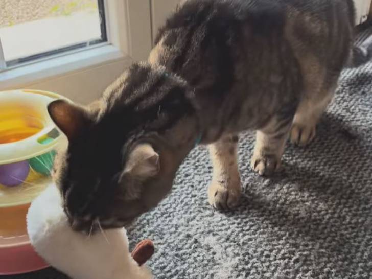 Cette vidéo montre un chat Européen très attaché à son doudou. En effet, le félin semble choisir lui-même d'attraper le lapin bleu en peluche sur l'étagère et l'emporte avec lui pour aller dormir. Sa propriétaire s'amuse de la situation et écrit que l'animal choisit certains soirs d'autres peluches pour l'accompagner dans son sommeil.