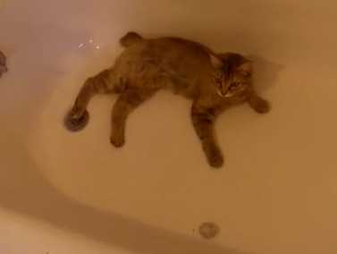 En général les chats préfèrent éviter la baignoire, principalement du fait de leur aversion pour l'eau. Or, ce chat de la race de Manx a dû se rendre compte que jouer avec une balle de papier était encore plus drôle lorsqu'on le fait dans la baignoire, avec ses parois bien glissantes qui rendent la trajectoire de la balle imprévisible.