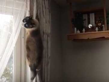 Un chat Snowshoe s'est mis en tête qu'il devait accéder à la petite étagère située tout en haut du mur de l'appartement où il vit. Il va pour cela utiliser une technique qui n'est pas habituellement appréciée par les maîtres et va grimper à plusieurs reprises aux rideaux sans pour autant atteindre son but.