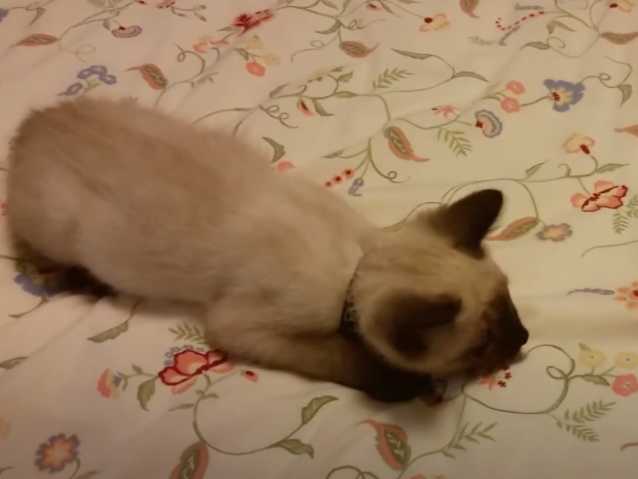 Cette vidéo montre un Bobtail du Mékong en train de jouer avec son propriétaire. En effet, le petit félin est sur le lit et à l'affut des mouvements de la main de son maitre. C'est une belle partie de jeu pour ce chaton !