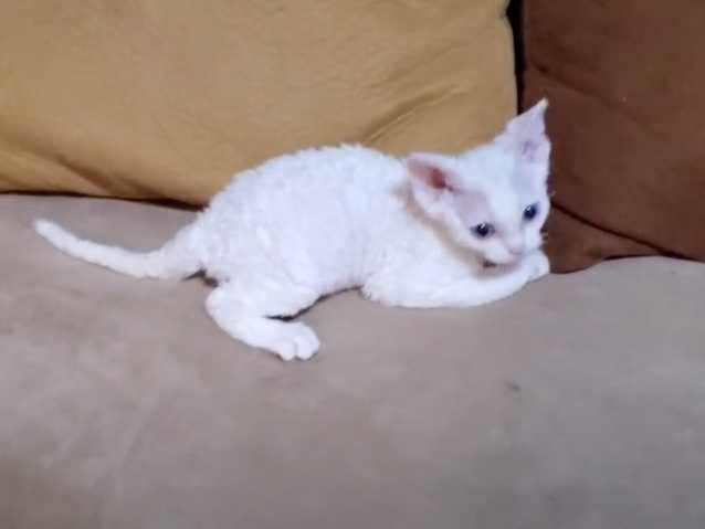 Cette vidéo montre un chat de race Devon Rex en train de jouer sur le canapé avec son propriétaire. En effet, le petit félin joue avec la main de ce dernier, essaie de l'attraper et se roule même sur le dos pour obtenir quelques caresses. Il semble prendre plaisir à partager ce moment de complicité.