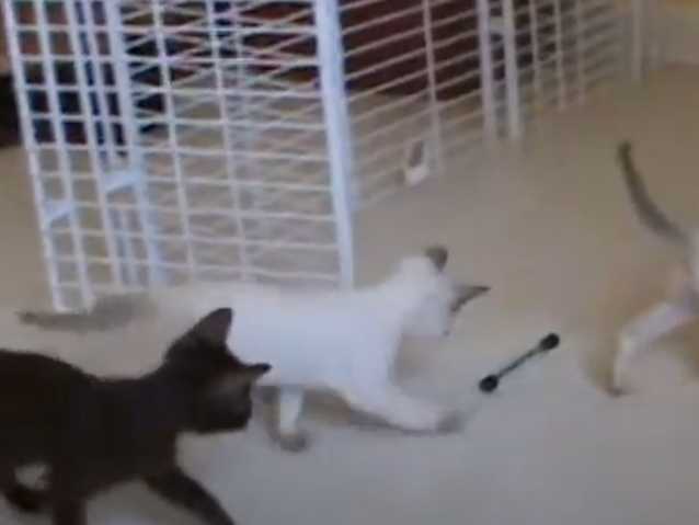 Cette vidéo montre plusieurs chatons Havana Brown qui jouent avec un plumeau. Ils semblent adorer ce moment de jeu car tous les félins s'amusent ensemble et de manière très complice.