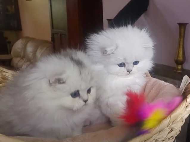 Cette vidéo montre un très beau moment de complicité entre une fratrie de chatons Chinchilla. En effet, ces derniers sont positionnés dans l'arbre à chat et jouent avec un jouet en forme de plumeau. Les petits félins semblent très complice dans le jeu.