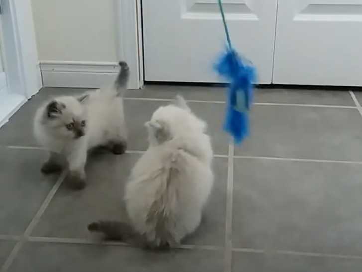 Cette vidéo montre de très beaux chatons Himalayen cohabitant ensemble. En effet, les petits félins de quelques semaines semblent être très complices. Ils sont positionnés sur le sol et s'aident pour attraper le jouet plumeau qu'anime leur propriétaire : une vraie partie de jeu !