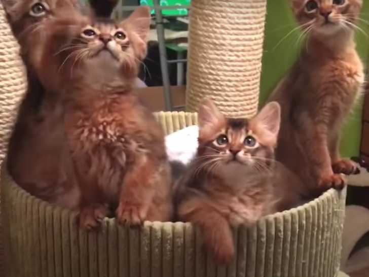 Cette vidéo montre des chatons de race Somali en train de jouer dans l'arbre à chat avec leur propriétaire. En effet, les petits félins sont très intrigués pas ce grand accessoire pour chat qui est un plumeau et s'en donnent à coeur joie : une vraie partie d'amusement !