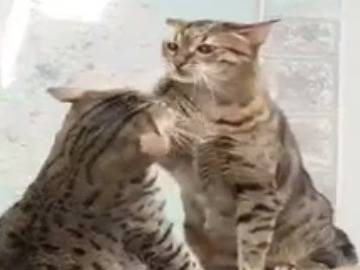 Pixie et Pippin, deux chats Mau Egyptien, se disputent amicalement le droit de propriété du dos de leur maître. Lequel des deux pourra revendiquer d'être le plus fort et le chef au sein du foyer, c'est tout l'enjeu de cette compétition. Une scène adorable où leur maître s'amuse visiblement beaucoup.