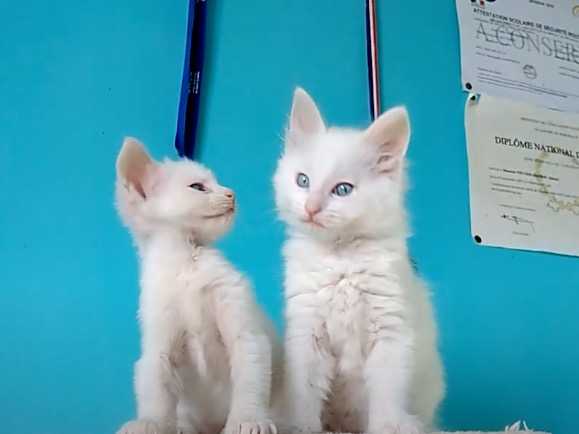 Des chatons et leur maman Angora Turc s'amusent sur l'arbre à chat. En effet, un des chatons souhaite taquiner sa maman alors que cette dernière est en pleine séance de toilettage. Elle n'hésite pas à lui faire comprendre que ce n'est pas le moment de jouer avec elle : le petit félin n'a pas l'air très content, et se rabat alors sur son congénère.