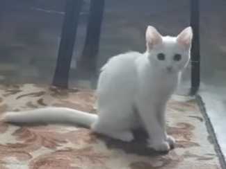 Un chaton Khao Manee s'amuse tout seul avec une boîte en carton. Ses maîtres ont eu l'idée d'ouvrir la boite sur un côté pour créer une ouverture, de quoi occuper ce chat réputé comme étant vif et actif. Le petit chat se fait un plaisir de courir et entrer dans la boîte à toute vitesse.