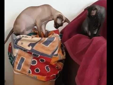 Un Levkoy Ukrainien s’est installé au-dessus d’un carton sur lequel on a placé un drap. Un autre s’est confortablement posé sur le canapé à côté pour l’observer. Le troisième dans le carton s’amuse à attraper la queue de celui qui le surplombe. Le tissu se soulève et la boîte oscille. Le jeu excite les chats qui se donnent des coups de pattes. Celui dans le carton sort de sa cachette pour voir ce qu’il se passe avant de se jucher à son tour sur le canapé. Il en est délogé par un autre qui pose tranquillement devant la caméra.