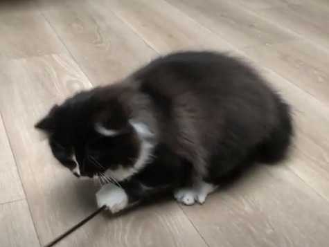 Cette vidéo montre le propriétaire du chat Cyrmic qui essaie de le stimuler. En effet, à l'aide d'un jouet en forme de plumeau, le maitre tente de titiller son félin qui semble répondre favorablement aux diverses tentatives.