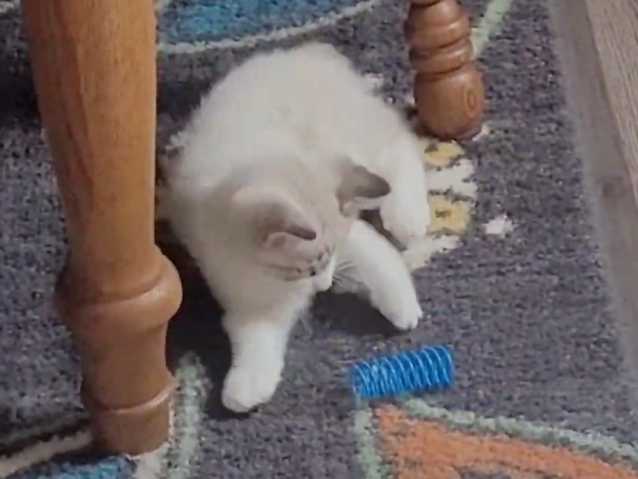 Cette vidéo montre un très mignon chat Cymric en train de jouer sur le tapis. En effet, le petit félin s'amuse avec un jouet en forme de ressort.