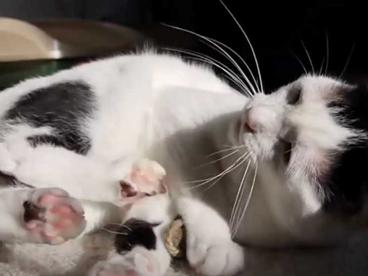 Cette vidéo montre un chat Bobtail Japonais de nature très joueuse. Effectivement, ce dernier est en train de jouer avec une sorte de balle qu'il a attrapé avec ses pattes. Il s'amuse avec son jouet avec beaucoup d'intérêt, car il est essaie de le mordiller et lui donne même des coups avec ses pattes arrières.