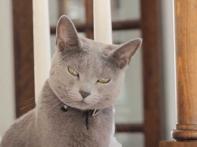 Cette vidéo montre un chat de race Bleu Russe en train de jouer en haut d'un escalier, sous l'oeil complice de son propriétaire. Le félin a l'air de prendre plaisir à jouer avec les barreaux blancs, car il se roule sur le sol tout en essayant d'attraper les barres de l'escalier. Il semble détendu et en totale confiance.