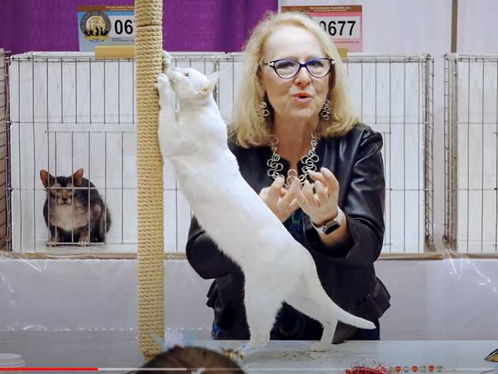 Cette vidéo montre un chat de race Khao Manee qui participe à un concours de beauté dans le cadre de l'exposition féline 2018 du CFA International Show de Cleveland, Ohio (USA). Durant cet événement, le félin est examiné par un juge afin de définir son classement par rapport aux standards de sa race.